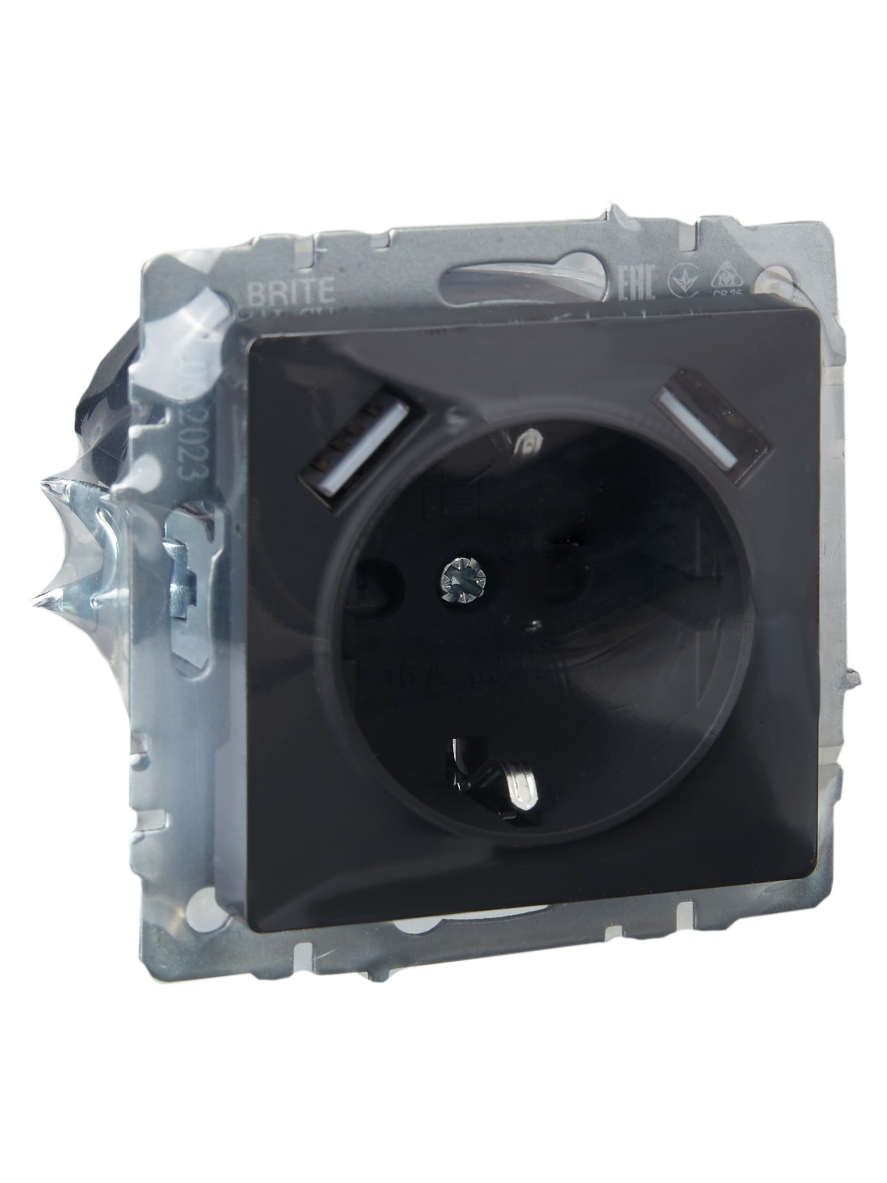 BRITE Розетка 1-местная с заземлением с защитными шторками 16А с USB A+A 5В 3,1А РЮш10-2-БрГ графит IEK