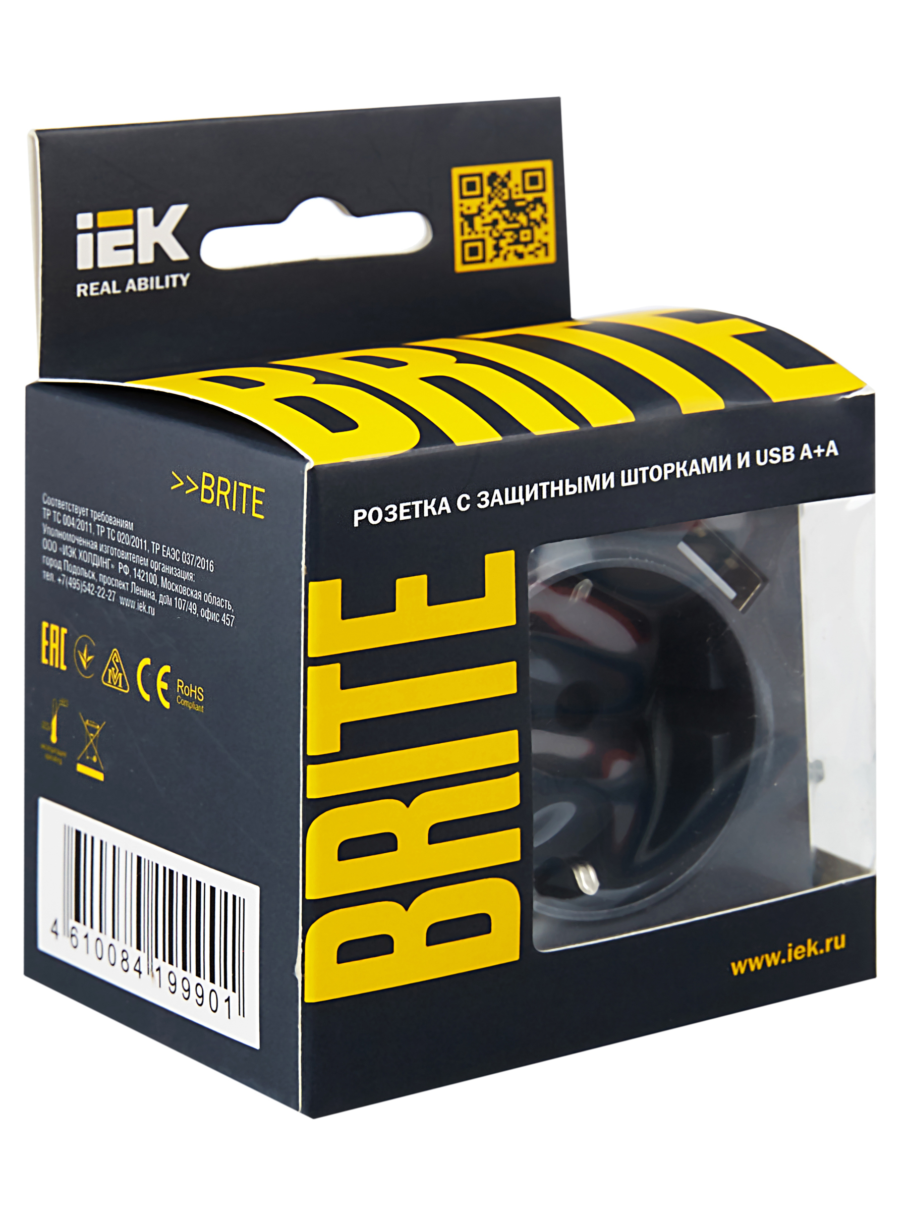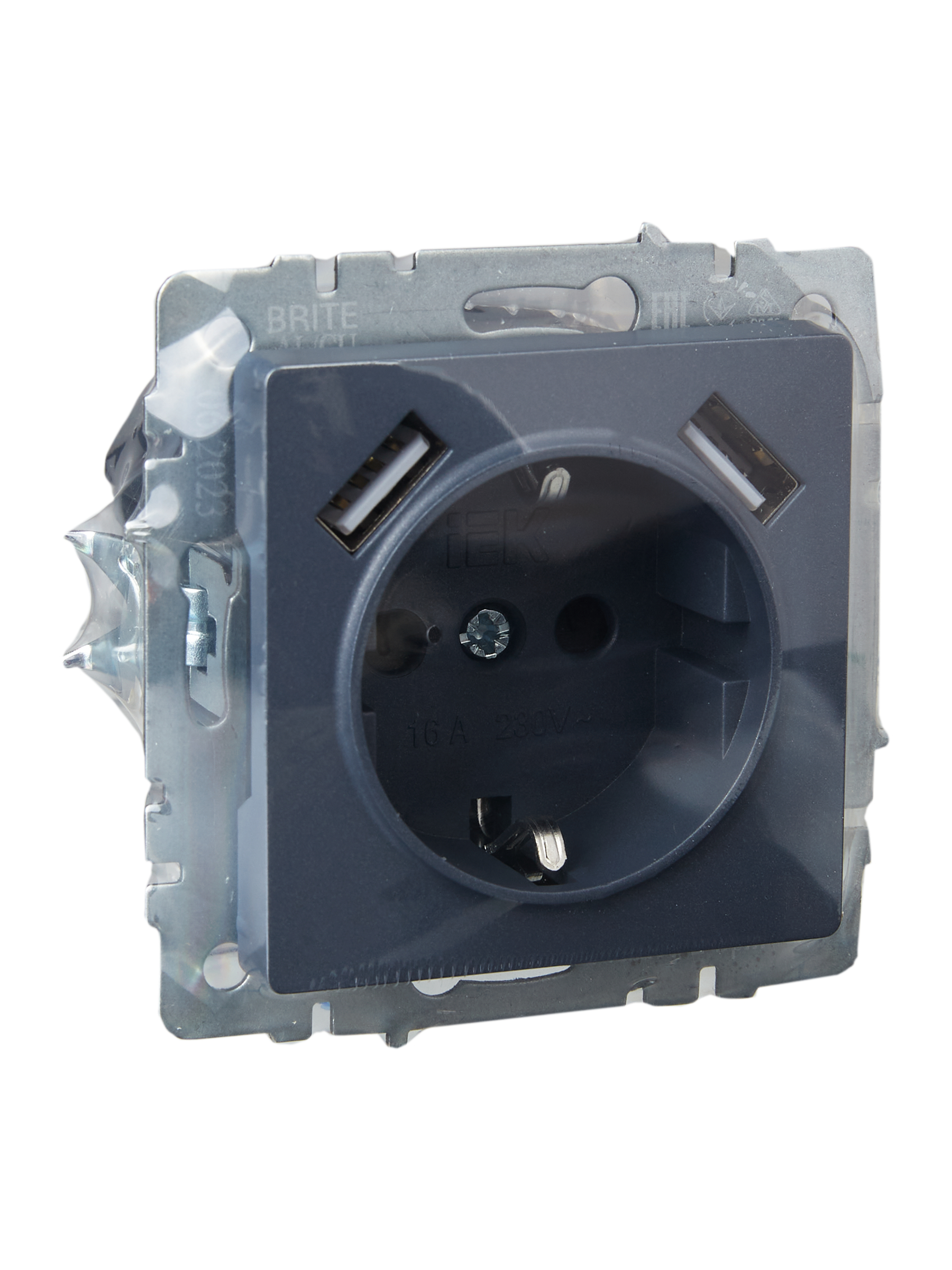 BRITE Розетка 1-местная с заземлением с защитными шторками 16А с USB A+A 5В 3,1А РЮш10-2-БрМ маренго IEK
