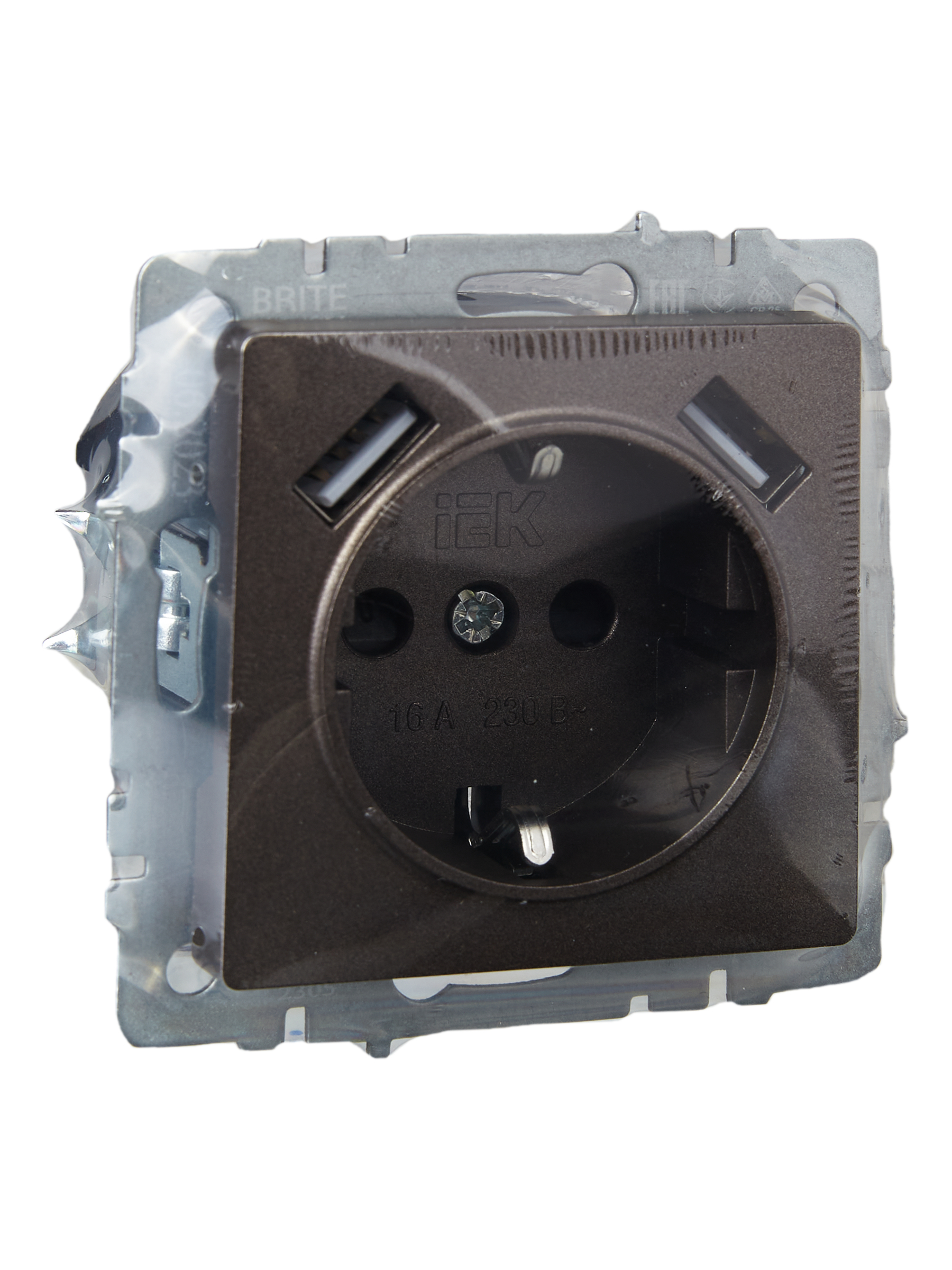 BRITE Розетка 1-местная с заземлением с защитными шторками 16А с USB A+A 5В 3,1А РЮш10-2-БрТБ темная бронза IEK